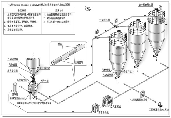 該輸送方式是利用高于0.1kg/cm2的氣體壓力,使用正壓氣體來推動物料通過輸送管線,因此常被稱作為高壓-低速系統(tǒng)。該系統(tǒng)的氣體-物料比很低。此系統(tǒng)的初端速度約為120m/min 的啟動速度,在末端較高約為1200m/min,輸送管線的壓力一般為0.1-3.0kg/cm2,在系統(tǒng)末端則幾乎為零。該系統(tǒng)采用空氣壓縮機作為動力源,它的顯著特點是輸送速度低,對物料破碎率小,空壓機作為動力源,采用的氣源均為潔凈、干燥的,對于物料品質(zhì)的影響較小。