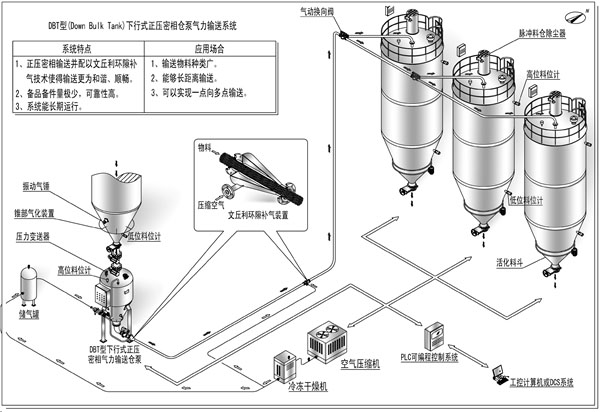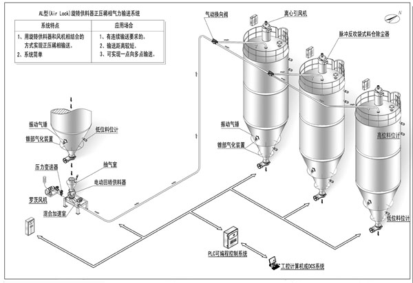 正壓輸送的特點是安裝與運行較為簡單,系統(tǒng)維護少,安裝空間較小,一次成本投入較少。