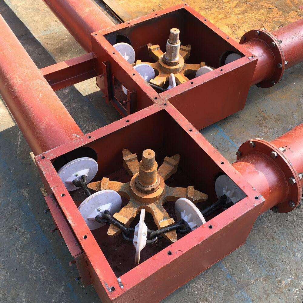 管鏈輸送機包括主動箱(從動箱)、8齒鏈輪、電機減速機、帶盤片的輸送鏈條,輸料管道。